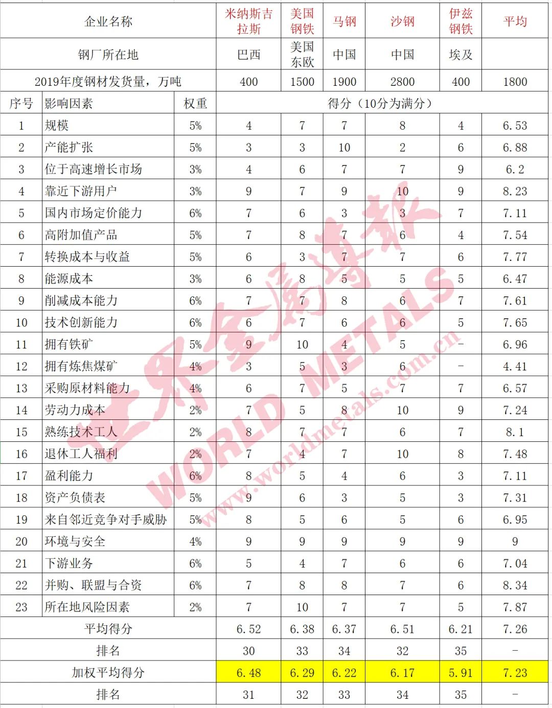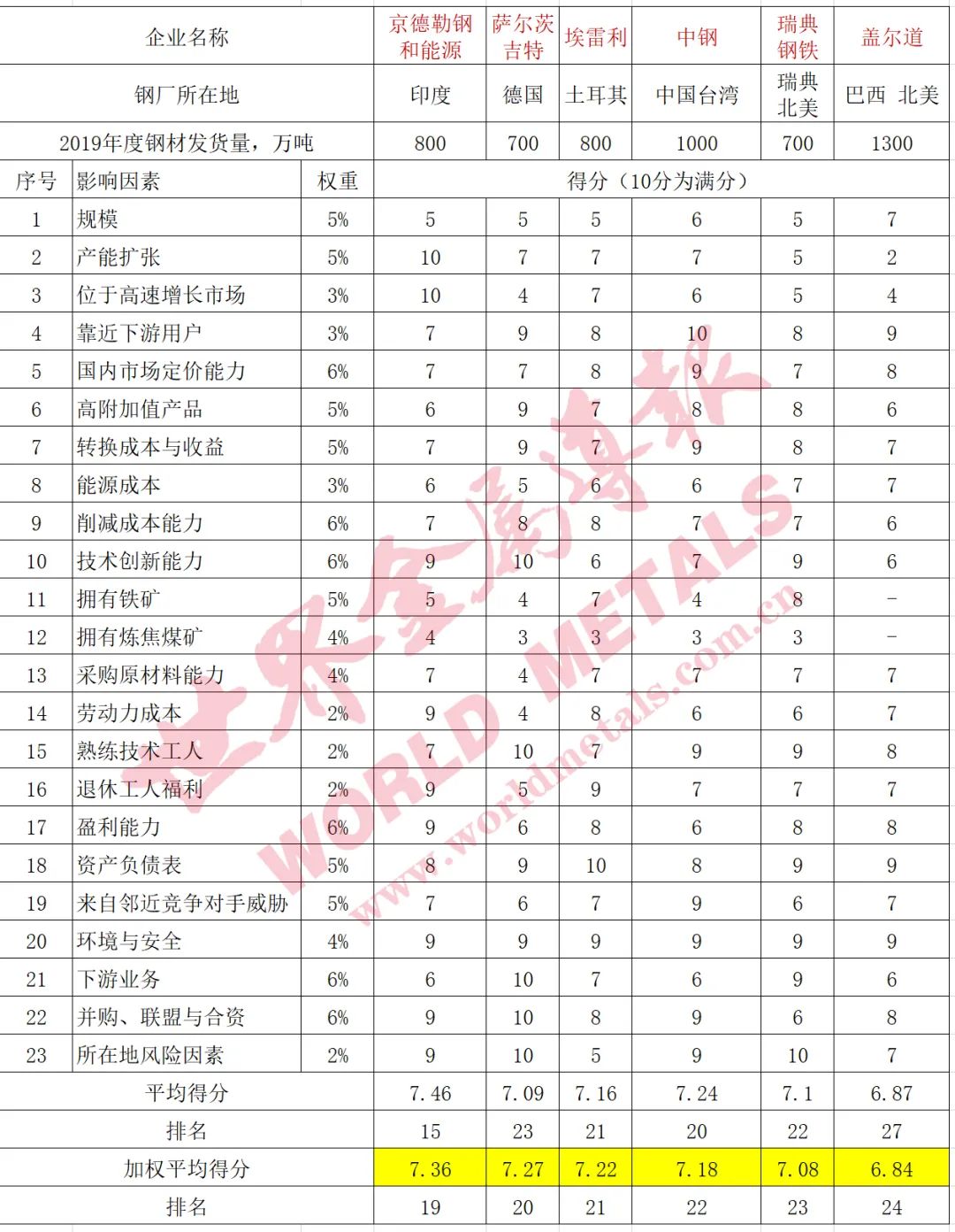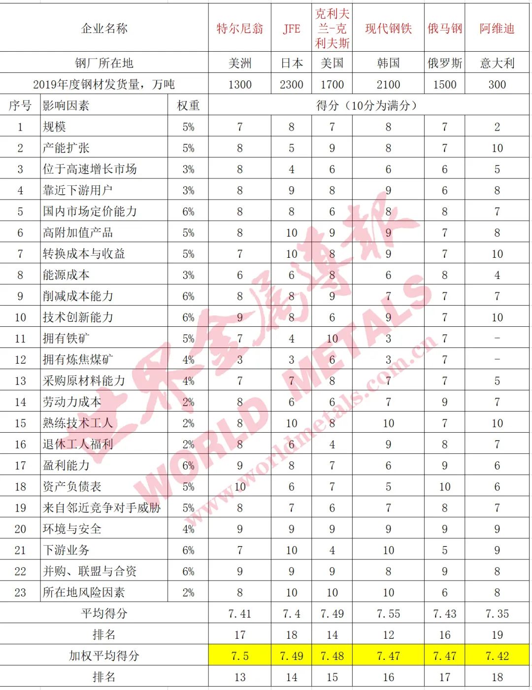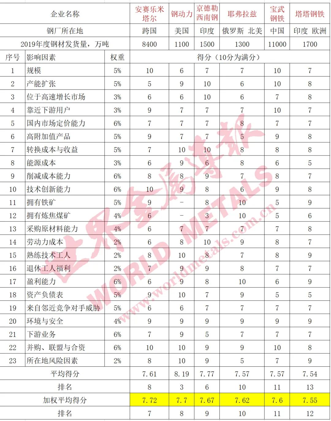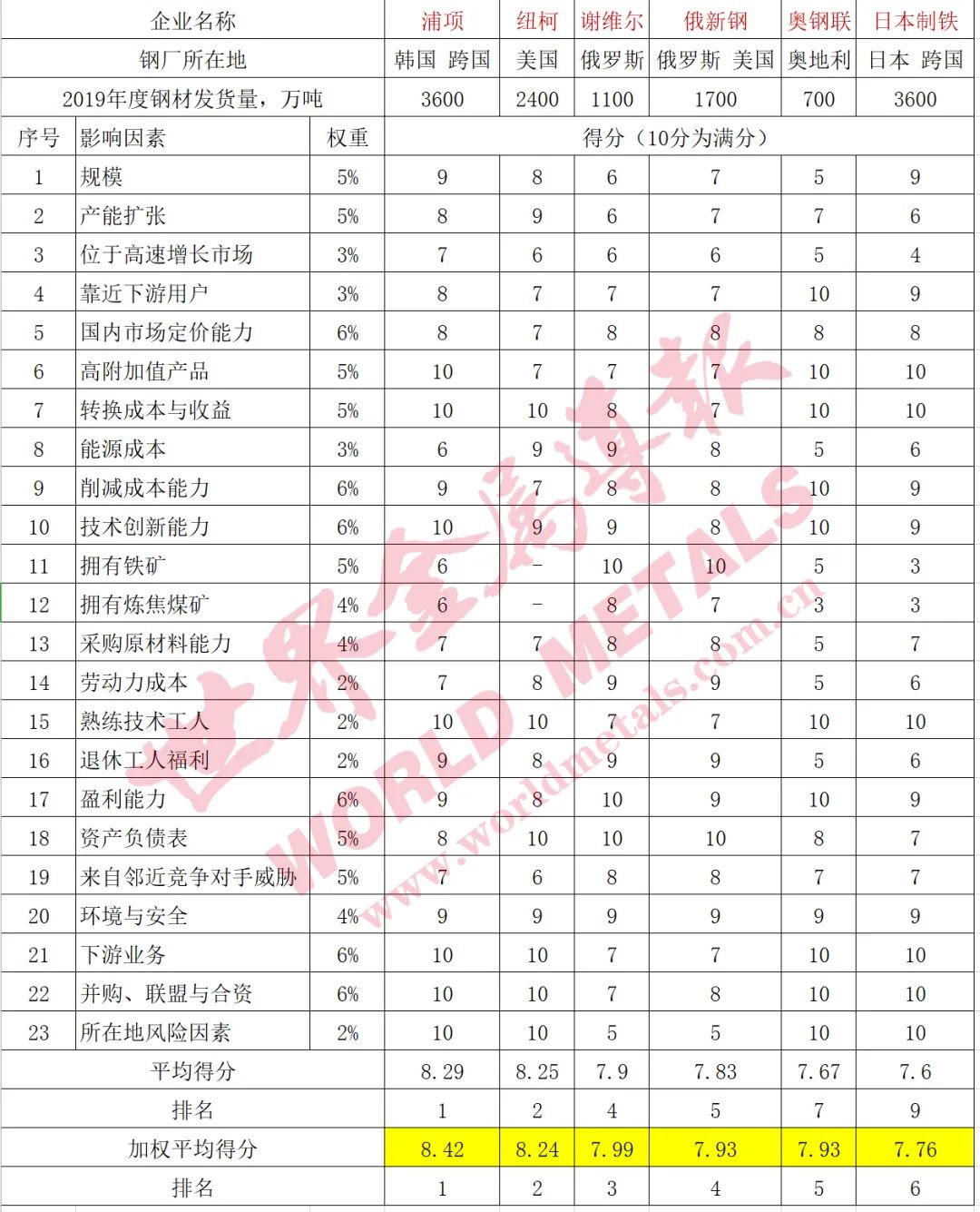 浦項作為全球最具競爭力的鋼鐵企業,23個評分項目中在高附加值產品、轉換成本與收益、技術創新能力、熟練技術工人方面的優勢、下游業務、并購與合資、所在地風險因素等七個方面獲得10分的滿分,與去年相同;盈利能力的評分為9分,比上年高1分;其他指標的評分均與上年相同。最終,該公司以加權平均得分8.42分繼續獨占鰲頭,但相對第二名紐柯公司(8.24分)的優勢進一步縮小。