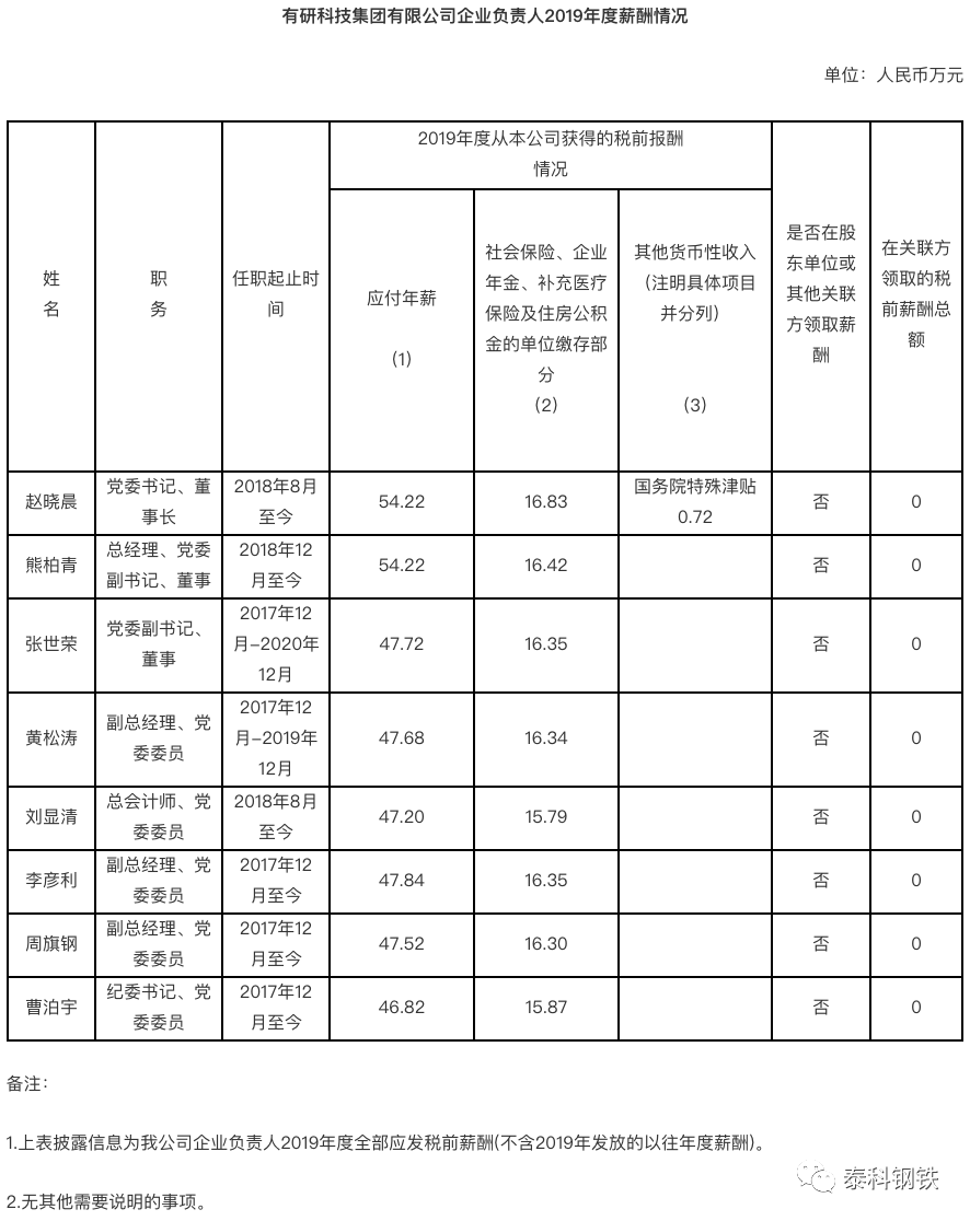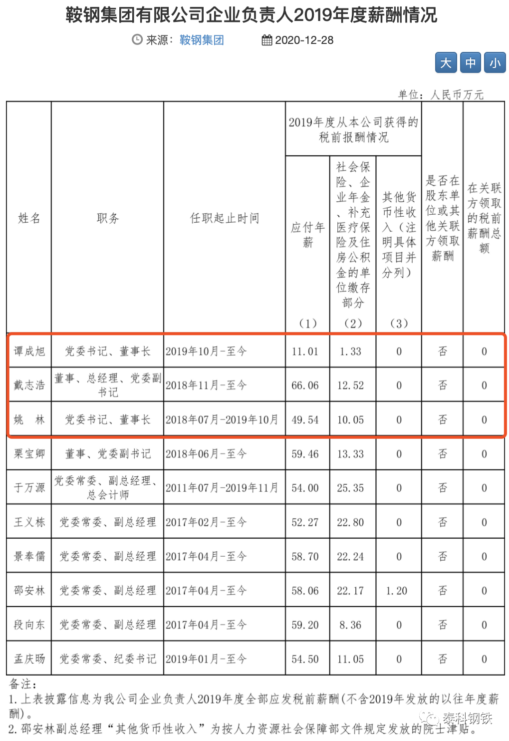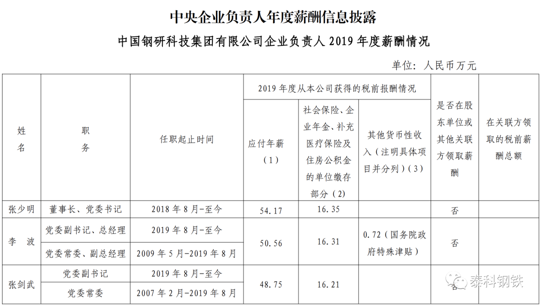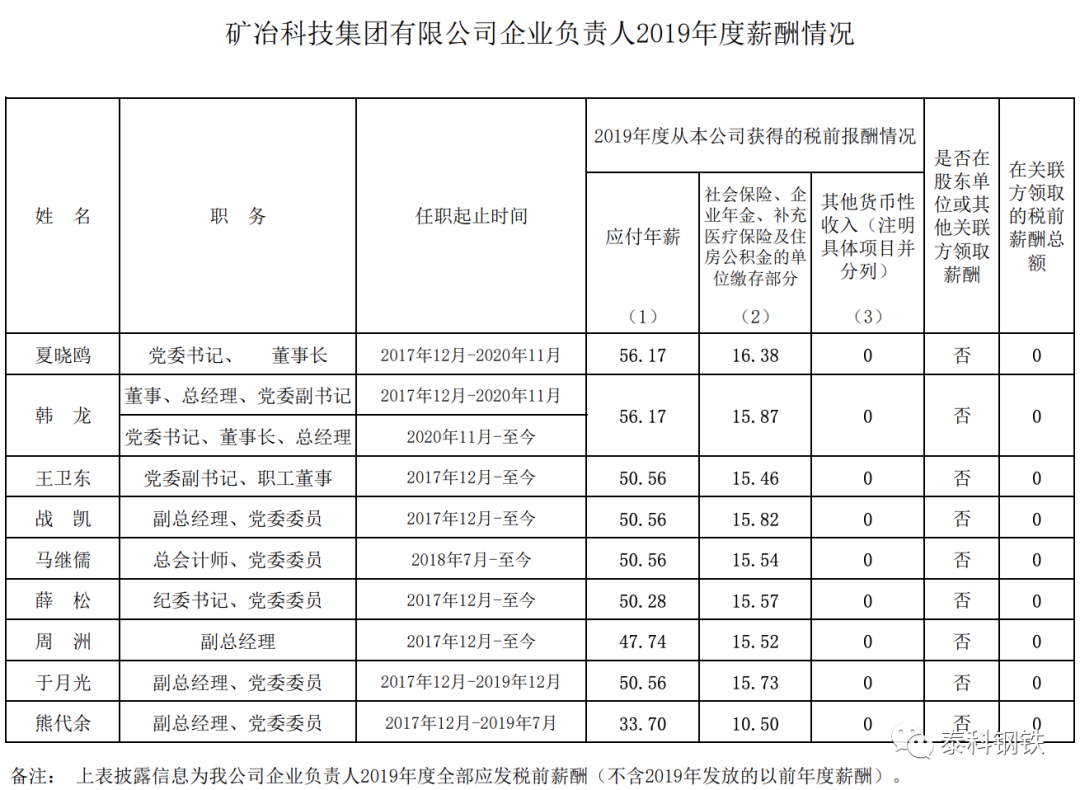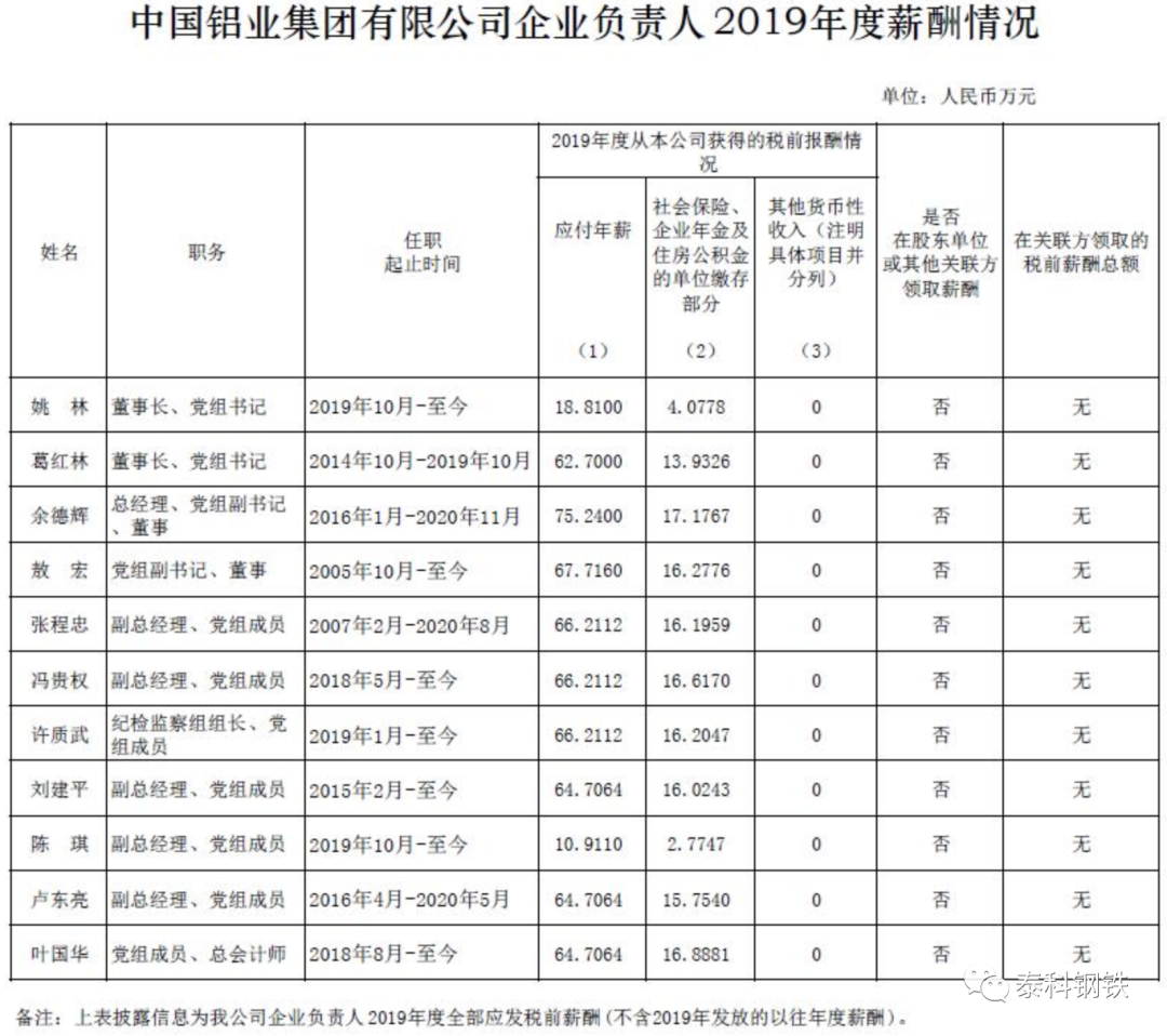 2020年12月底,中國寶武、鞍鋼、五礦、中鋼集團、中鋁集團、新興際華、中國鋼研等鋼鐵冶金行業相關央企負責人2019年度薪酬情況陸續公布,具體薪酬表如下: