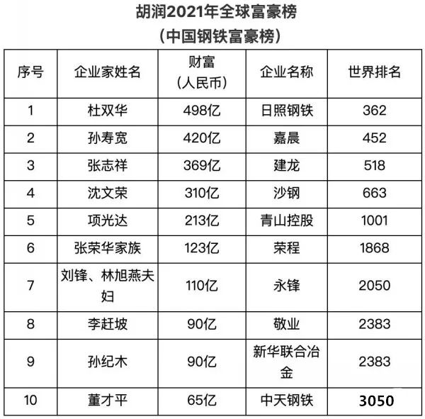 而杜雙華的日照鋼鐵平穩(wěn)得渡過了之前關(guān)停風波,還在持續(xù)加碼新產(chǎn)能。日照鋼鐵集團將在山東日照市嵐山區(qū)建設3000m高爐2座、300t轉(zhuǎn)爐2座,換算成產(chǎn)能為煉鐵產(chǎn)能500萬噸、煉鋼產(chǎn)能600萬噸,開工時間為2020年,擬投產(chǎn)時間為2022年。值得注意的是,山東省相關(guān)部門在官網(wǎng)披露60家擬入庫重點培育的“十強”產(chǎn)業(yè)集群領(lǐng)軍企業(yè)中,日照鋼鐵控股集團有限公司為山東眾多實力強大的鋼鐵企業(yè)中的唯一入選者。渡盡劫波的鋼鐵首富,如今真的穩(wěn)穩(wěn)地歸來了。杜雙華一路走來,經(jīng)歷了種種的困難,但是他從來沒有害怕過,每一次面對困難,他都是迎難而上。8年前,杜雙華個人財富降至150億,2019年福布斯數(shù)據(jù)顯示其財富進一步萎縮至76億人民幣,2020年,胡潤富豪榜顯示其財富又暴增回410億人民幣。今年,達到了500億。近20年間,杜雙華的財富起起伏伏,但其一手建立的商業(yè)帝國始終沒有隕落。財富、權(quán)勢扔進進擊的時代,會生出一種爆裂的擴張性。杜雙華乘著這種東風而起,也在市場溫平后漸漸蟄伏。他的人生路上有恢弘發(fā)跡、盛名之下的繁花,也有與妻子對簿公堂、為管理公司頭疼欲絕的荊刺,但當站在當下回望,那些都過往都成了暈染的點墨,濃墨重彩又無關(guān)緊要地修飾著他的人生。