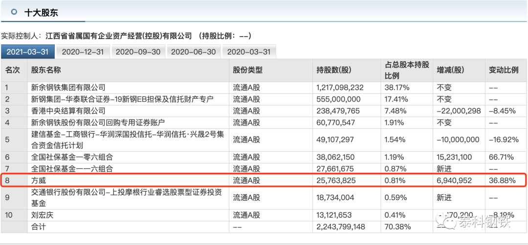 根據新鋼股份發布的2021年一季報顯示,自然人方威增持新鋼股份6940952股,已持有25763825股,成為第8大股東。方威究竟是民營鋼鐵之王“遼寧方大”的掌門人,還是同名的另有其人還不能確定。