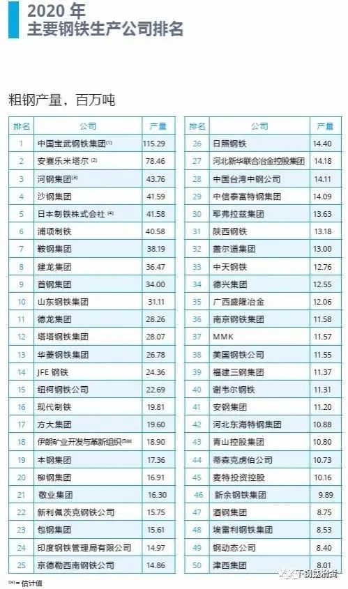 全球50家鋼鐵廠產(chǎn)量TOP50排名!