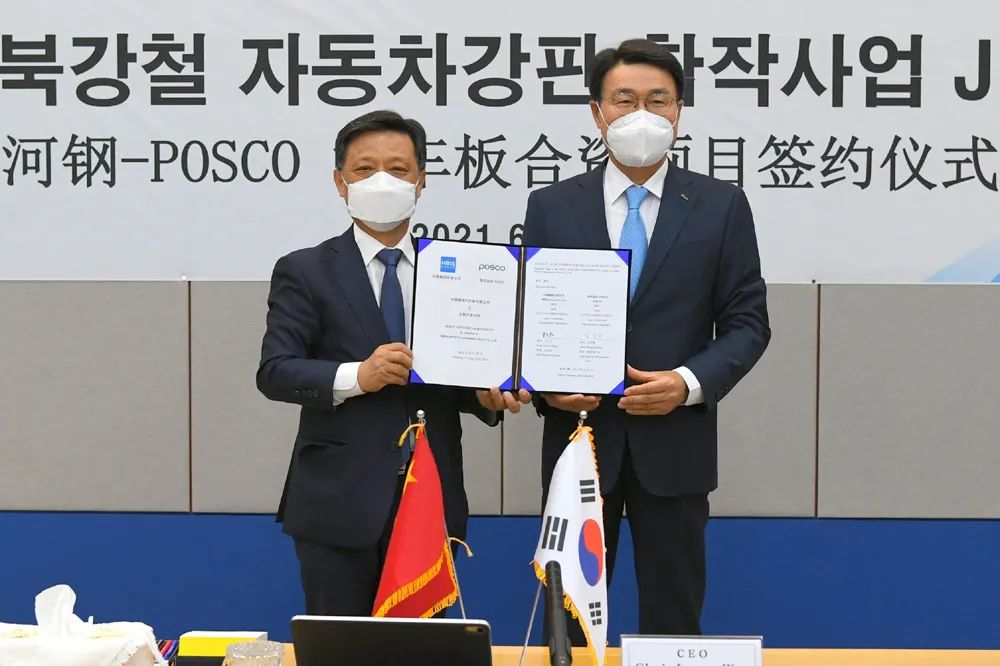 2021年6月25日,河鋼集團與韓國株式會社POSCO以視頻會議形式舉行河鋼POSCO汽車板合資項目簽約儀式, 正式落地實施年產135萬噸的高端汽車面板項目,將雙方全面合作關系推向新的高度。