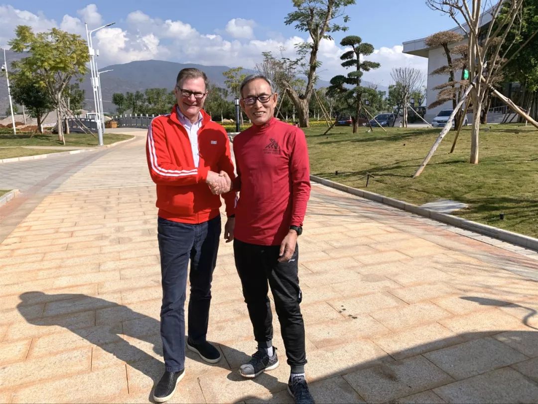 我和大衛(wèi)·斯蒂克勒交流都是由他太太李博佳幫我們翻譯。聽說我已經跑過130場馬拉松之后大衛(wèi)·斯蒂克勒伸出大拇指給我點贊,他指著手腕上的手環(huán)說,每天要徒步兩萬步左右。