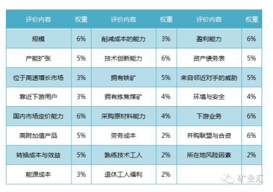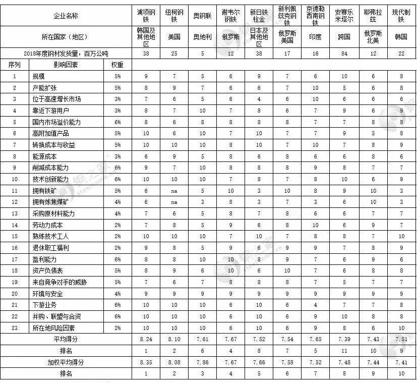 世界鋼動態(tài)(WSD)的競爭力排行評價因素包括規(guī)模、產(chǎn)能擴(kuò)張、位于高速增長市場、靠近下游用戶、國內(nèi)市場溢價能力、高附加值產(chǎn)品、轉(zhuǎn)換成本與收益、能源成本、消減成本能力、技術(shù)創(chuàng)新能力、擁有鐵礦、擁有煉焦煤礦、采購原材料能力、勞動力成本、熟練技術(shù)工人、退休職工福利、盈利能力、資產(chǎn)負(fù)債表、來自競爭對手的威脅、環(huán)境與安全、下游業(yè)務(wù)、并購聯(lián)盟與合資、所在地風(fēng)險因素等23項指標(biāo),每一項的滿分均為10分,根據(jù)每項考察項目的重要性其權(quán)重各有不同,所有評價加權(quán)平均后得出最后分?jǐn)?shù)。