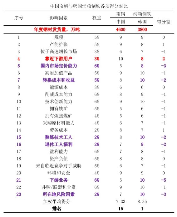 與連續(xù)十年競爭力排名第一的韓國浦項制鐵對比,寶鋼僅僅在靠近下游用戶一項上獲得滿分,比浦項多獲得2分,占有優(yōu)勢;在產(chǎn)能擴(kuò)張、勞務(wù)成本兩項上稍占優(yōu)勢,僅比浦項多獲得1分。