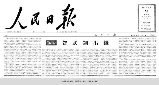 《人民日報》1958年9月14日頭版頭條刊發(fā)文章《賀武鋼出鐵》