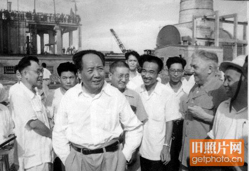 1958年9月13日,毛澤東主席視察武鋼,看高爐出第一爐鐵。左起:李一清(武鋼經(jīng)理)、毛澤東主席、張治中(全國政協(xié)副主席)、王任重(湖北省委書記)、巴杜洛夫(蘇專家組組長),左2為李銀橋(衛(wèi)士),右3為俄語教師陶漢英。