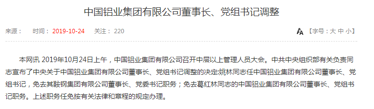 據中國鋁業集團有限公司網站消息,2019年10月24日上午,中國鋁業集團有限公司召開中層以上管理人員大會。中共中央組織部有關負責同志宣布了中央關于中國鋁業集團有限公司董事長、黨組書記調整的決定:姚林同志任中國鋁業集團有限公司董事長、黨組書記,免去其鞍鋼集團有限公司董事長、黨委書記職務;免去葛紅林同志的中國鋁業集團有限公司董事長、黨組書記職務。上述職務任免按有關法律和章程的規定辦理。