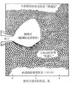 風(fēng)口回旋區(qū)的大小影響因素有很多,除了受鼓風(fēng)參數(shù)影響外,還受爐料形態(tài)的影響。回旋區(qū)呈現(xiàn)向上的一個(gè)“布袋型”。回旋區(qū)內(nèi)焦炭以粒度細(xì)小的焦粉形態(tài)存在,越往外圍,焦炭粒度越大。
