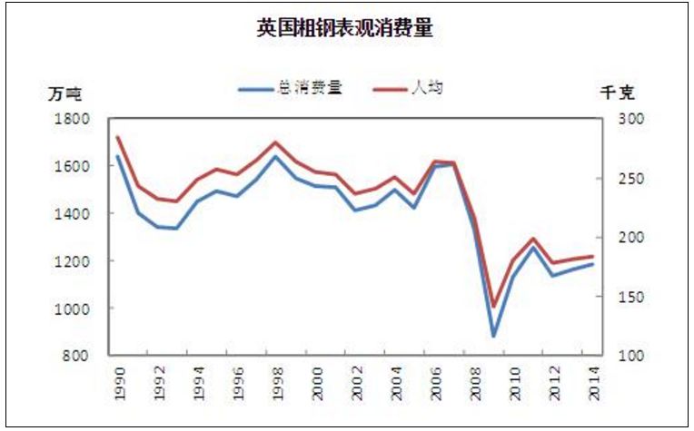 除外來競爭,英國自身對鋼鐵的需求也沒有出現增長。1990年粗鋼表觀消費量和人均表觀消費量分別為1637萬噸和284.4千克,2014年兩數值則分別為1184.2萬噸和184.1千克。需求的不足也注定了英國鋼鐵行業的衰落。