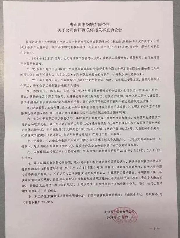 2018年12月26日,唐山市相關政府下發《關于限期關停唐山國豐鋼鐵有限公司南區的通知》,決定唐山國豐鋼鐵有限公司南區于2018年12月28日前實施關停。屆時繼2016年一季度退出的國豐北區200萬產能之后,再退出剩余的南區580萬噸產能。