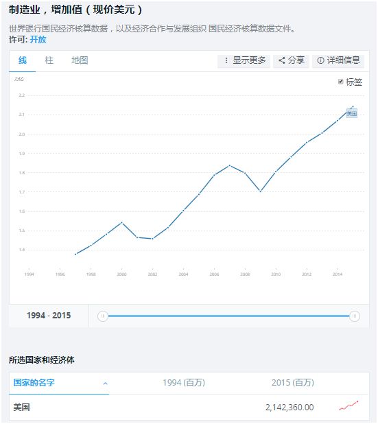 美國制造業增加值是世界第二位:2.142萬億美元,是中國的65.88%
