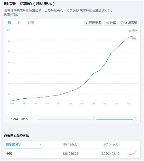 世界銀行數據顯示這四個新興國家2015年的制造業增加值: