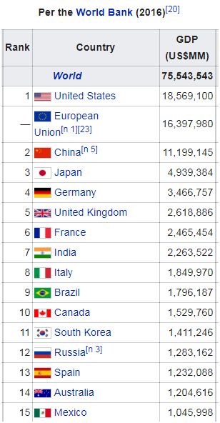 下圖是世界銀行版本的2016年世界經濟15強。之所以只看15強,是因為國家體量太小,跟我國比制造業水平意義不大,第15位的墨西哥,經濟總量只有中國的9.34%了。