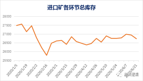 結論:把鐵礦石進口過程中的主要環節匯總起來看,即1+2+3+4+5,截至6月21日,這些環節中的鐵礦石庫存總量約2.67億噸,較年內低點增長3.7%。從總量的變化趨勢來看,總庫存自2月末達到年內低點后持續回升;盡管回升速度相對緩慢,但鐵礦石整體累庫趨勢仍未改變。因此關注中國港口鐵礦石庫存的同時,也不能忽視鐵礦石供應鏈中各環節的整體庫存情況。