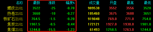 期貨震蕩收跌,期螺跌25收報3522,期卷跌10收報3660,鐵礦石跌1.5收報764.5,焦炭跌8.5收報1907.5,焦煤跌15.5收報1244。