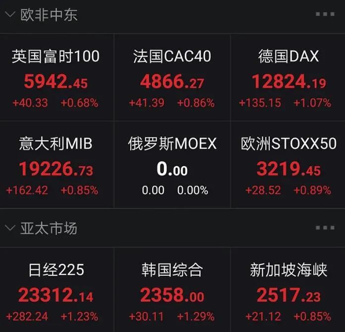 今天凌晨,德國DAX30指數(shù)收盤上漲1.09%,英國富時100指數(shù)收盤上漲0.71%,法國CAC40指數(shù)收盤上漲0.97%,歐洲斯托克50指數(shù)收盤上漲0.90%,西班牙IBEX35指數(shù)收盤上漲1.22%,意大利富時MIB指數(shù)收盤上漲0.99%。