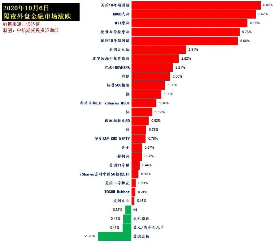 值得注意的是,昨夜十一點半,WTI原油期貨日內(nèi)漲幅一度擴(kuò)大至7%,報39.72美元/桶,布倫特原油期貨現(xiàn)漲6.06%。截至收盤,WTI原油漲6.46%;Brent原油漲5.76%;倫銅跌0.30%;黃金漲0.81%。美豆?jié)q0.17%;美豆粕跌1.68%;美豆油漲3.04%;美糖跌0.00%;美棉漲0.23%。