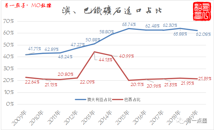 根據澳大利亞統計局的數據顯示,以金屬礦砂為主的礦產品一直是澳大利亞對中國出口的主力產品,2019年出口額為713.9億美元,增長29.0%,占澳對中國出口總額的68.7%。由于礦產品在對中國出口中的份額接近七成,礦產品對中國出口的表現基本決定了澳對中國出口的整體表現。如果我們將時間回溯10年,不難看到澳大利亞的鐵礦石往中國出口量一直在攀升,占比亦扶搖直上!