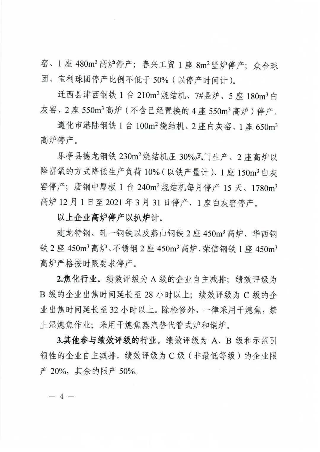 2.焦化行業。績效評級為A級的企業自主減排;績效評級為B級的企業出焦時間延長至28小時以上;績效評級為C級的企業出焦時間延長至32小時以上。除檢修外,一律采用干熄焦,禁止濕熄焦作業;采用干熄焦蒸汽替代管式爐和鍋爐。