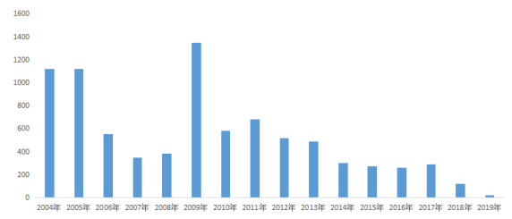 圖一:粗統2004-2019年以來中國廢鋼進口量(單位:萬噸)