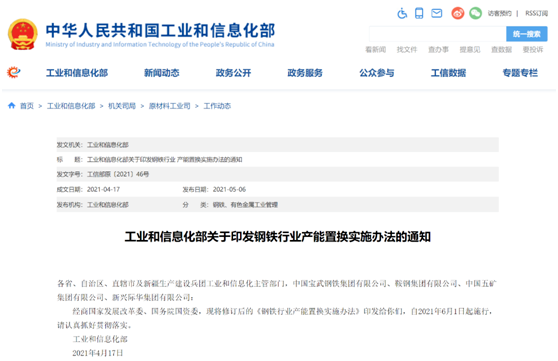 2021年5月6日,工業(yè)和信息化部印發(fā)修訂后的《鋼鐵行業(yè)產(chǎn)能置換實(shí)施辦法》(下稱《實(shí)施辦法》),自2021年6月1日起施行。其中,《實(shí)施辦法》提出了大氣污染防治重點(diǎn)區(qū)域嚴(yán)禁增加鋼鐵產(chǎn)能總量,長(zhǎng)江經(jīng)濟(jì)帶地區(qū)禁止在合規(guī)園3區(qū)外新建、擴(kuò)建鋼鐵冶煉項(xiàng)目等新增多項(xiàng)去產(chǎn)能要求。