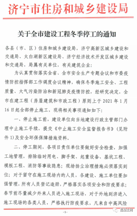 根據山東省濟寧市住建局下發的《關于全市建設工程冬季停工的通知》要求,原則上2021年1月16日起,全市在建工程(房屋建筑和市政工程)原則上全部停止施工,以更好貫徹落實全省、全市安全生產專題會議和市委疫情防控指揮部工作調度會議精神,確保冬季施工安全、工程質量、大氣污染防治和新冠肺炎疫情防控。 文件如下: