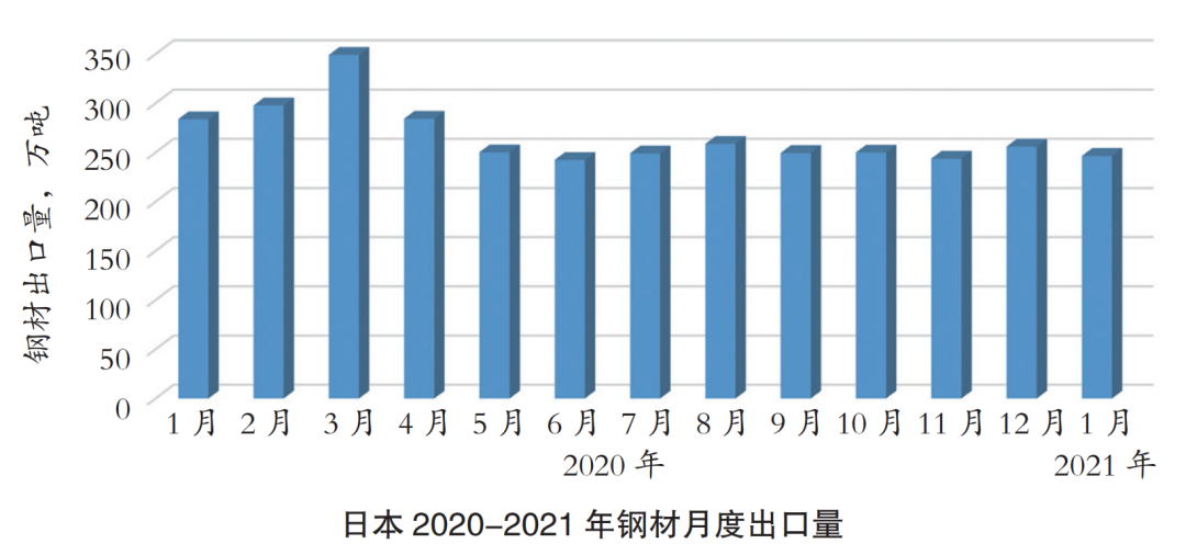 日本鐵鋼連盟數(shù)據(jù)顯示,日本在2021年1月份出口鋼材246.4萬噸,同比下滑13.1%,連續(xù)第九個月下降。其中,普通鋼材出口量為164.6萬噸,同比減少13.0%,亦為連續(xù)第九個月下降。