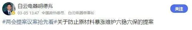 全國政協委員、白云電器董事長胡德兆發布#兩會提案議案搶先看#關于防止原材料暴漲維護六穩六保的提案。