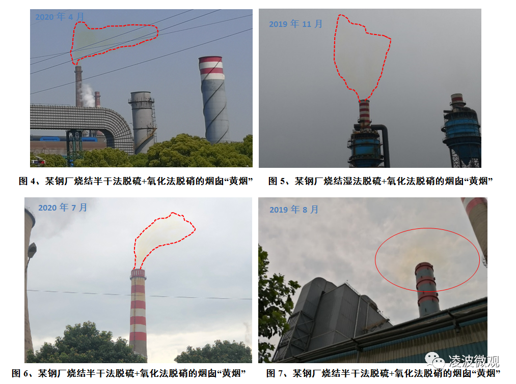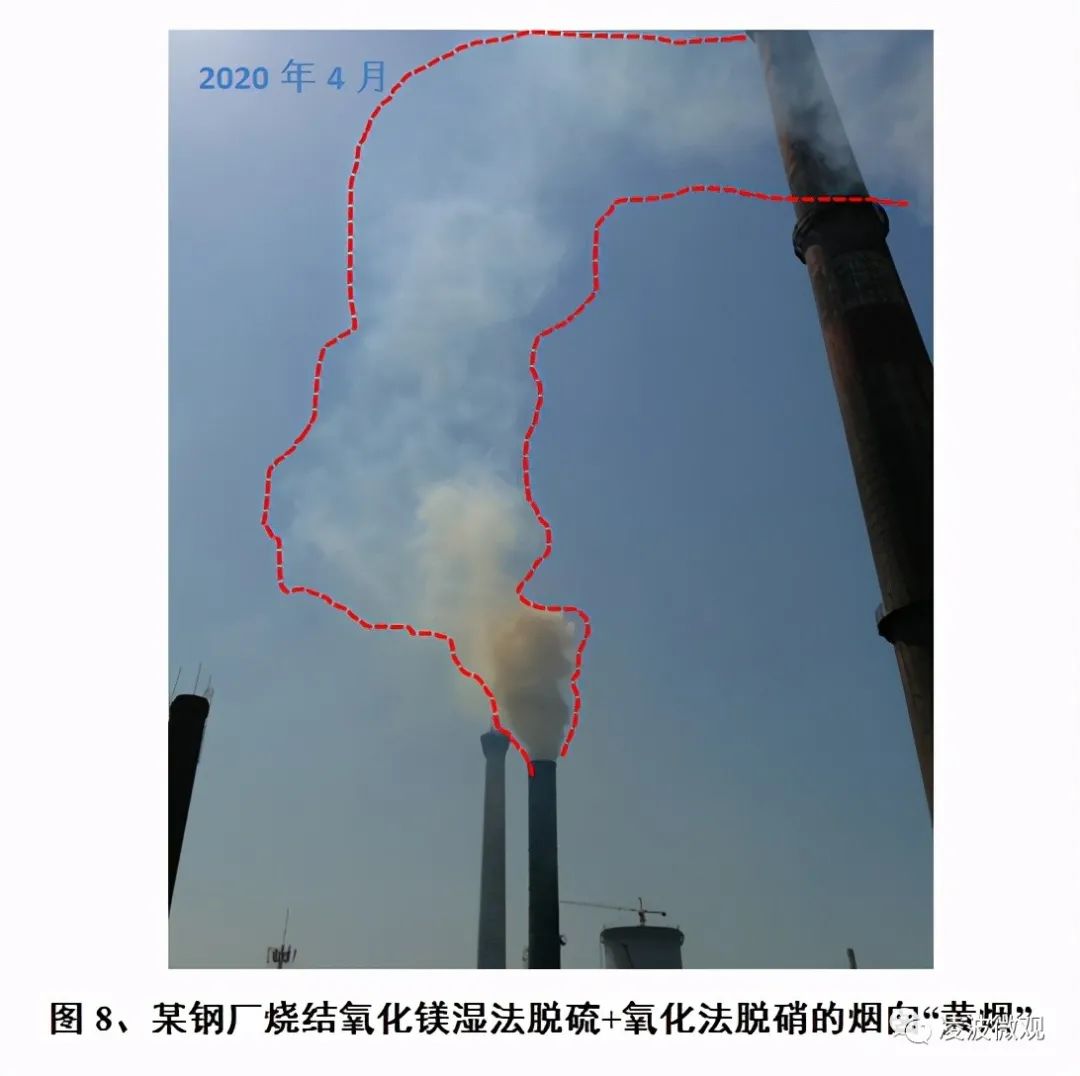 因此,氧化法脫硝如果僅將NO轉化為NO2,而沒有將NO2加以脫除,則對大氣質量的危害極大。河北、天津、江蘇、山東、廣東等地對應產能超過1億噸鋼的約七十多套燒結機采用氧化法脫硝工藝,且不少為穩定性差的簡易氧化法脫硝,造價甚至不到高效SCR脫硝的5%。通常的燒結氧化法脫硝CEMS在線排放監測儀只能測量NO,測量NO2需額外安裝NO2/NO轉化爐,將NO2轉化成NO來測量。由于原始煙氣NOx中的NO占比95%以上,NO2只占極少部分。因此,對于主流的SCR脫硝工藝而言,NO2與NO同時,且先于NO與NH3發生還原反應變成N2,這樣出口僅測量NO濃度,基本可反映真實的NOx排放濃度。因此,早期一些環保監管要求不嚴的地方,往往沒有強制要求鋼企在上傳環保的CEMS上安裝額外的NO/NO2轉化爐。但對于氧化法脫硝工藝而言,如果CEMS不安裝NO/NO2轉化爐,僅僅測量NO,則NOx測量結果將出現嚴重失真。氧化法脫硝工藝的CEMS即使配套采用NO/NO2轉化爐,也會因為轉化爐易失效而使得測量失真。因目前的NO2/NO轉化爐均為鉬爐,壽命僅為5000ppm·h。當氧化法脫硝出現“假脫硝”時,NO2濃度可達上百ppm,一般運行不了兩、三天,轉化爐即失效,這樣實際還是僅測量了NO。所以“假脫硝”上傳環保的NOx排放數據必定嚴重失真。因此,一些氧化法脫硝工藝裝置表面上看脫硝率很高,其實質只是NO轉化為NO2的轉化率很高,并不是脫除NOx的脫硝率很高。氧化法“假脫硝”現象,除了一些是常規CEMS測量NO2存在短板所致外,還有一種情況是人為的。對于半干法脫硫工藝配套的氧化法脫硝而言,NO2的中和吸收過程需要消耗比脫硫多一倍以上的堿性吸收劑。因此,一些企業為了省成本,就鉆一些CEMS無法直接測量NO2,需通過轉化爐導致測量易失真的空子,人為不增加滿足脫除NO2所需的堿性吸收劑。NO2氣體呈棕黃色。在天氣背景清晰的情況下,一些燒結氧化法“假脫硝”,可通過燒結脫硫脫硝煙囪冒“黃煙”來判定。下圖4~圖8是一些燒結氧化法 “假脫硝”煙囪冒“黃煙”的典型情況。這種肉眼清晰可見的“黃煙”,其對應的NO2濃度一般可達100mg/Nm3以上。