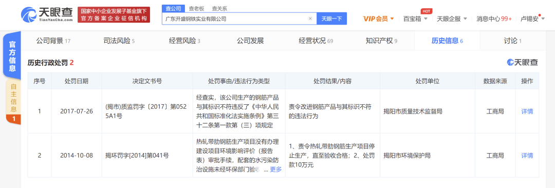 此外,2017年7月,該公司被揭陽市質(zhì)量技術(shù)監(jiān)督局處罰,事由為“該公司生產(chǎn)的鋼筋產(chǎn)品與其標(biāo)識不符違反了《中華人民共和國標(biāo)準(zhǔn)化法實(shí)施條例》第三十二條第一款第(三)項(xiàng)規(guī)定”,被工商局責(zé)令改進(jìn)鋼筋產(chǎn)品與其標(biāo)識不符的違法行為。