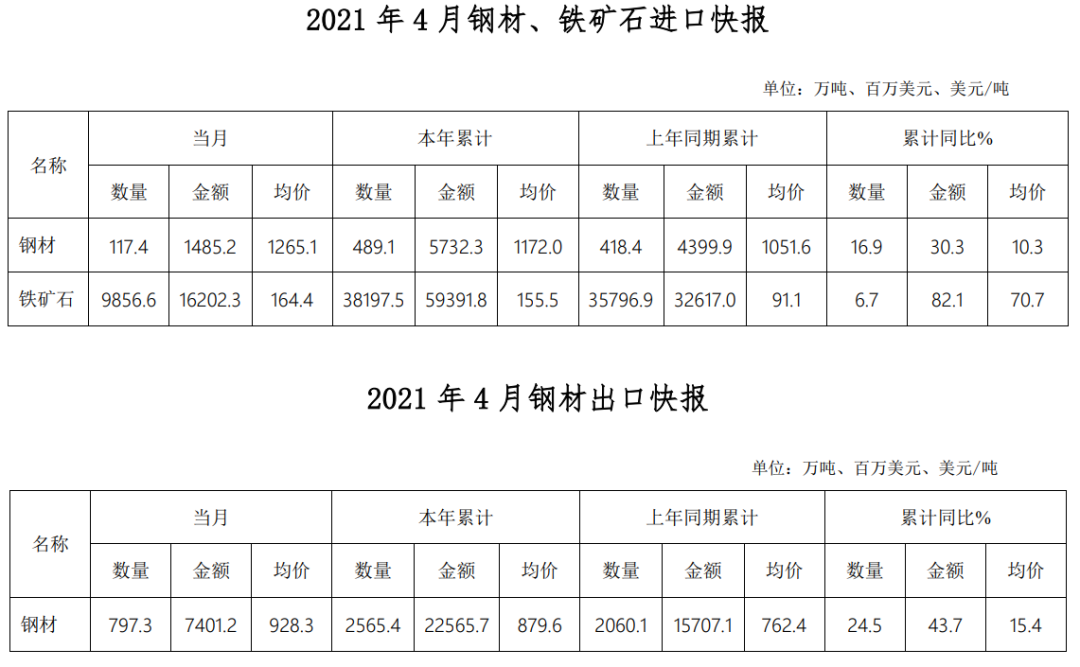 根據海關統計快訊數據,2021年4月,我國進口鋼材117.4萬噸,環比減少14.8萬噸,下降11.2%;均價1265.1美元/噸,環比增加38.5美元/噸,增長3.1%。1-4月累計進口鋼材489.1萬噸,同比增加70.7萬噸,增長16.9%。