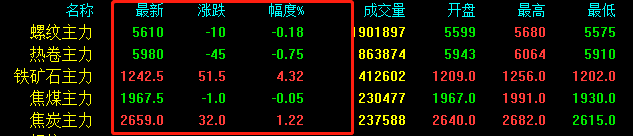 期鋼下跌遇支撐,期螺跌10收報5610,期卷下跌45收報5980,鐵礦石漲51.5收報1242.5,焦煤下跌1收報1967.5,焦炭漲32收報2659。整體原料走勢強于成材。