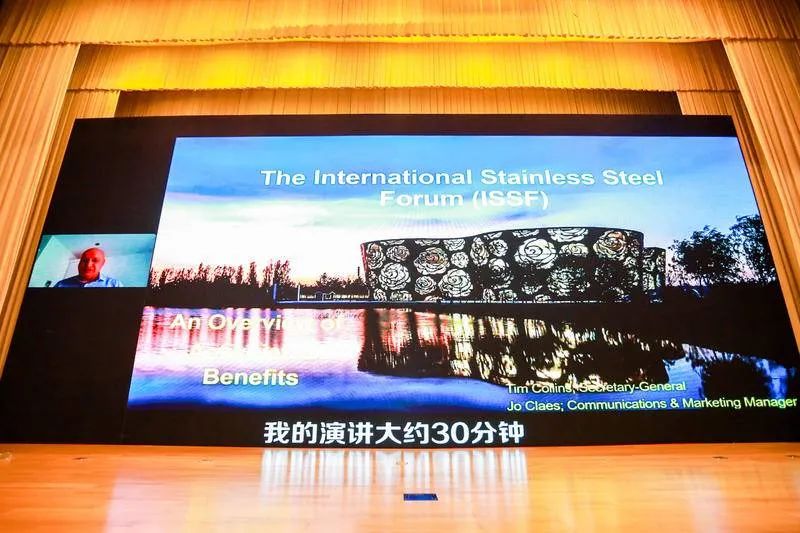 1.國(guó)際不銹鋼論壇(ISSF)秘書長(zhǎng)Tim  Collins ,以視頻方式為論壇帶來了精彩的演講,他以《國(guó)際不銹鋼論壇的主要活動(dòng)和關(guān)注焦點(diǎn)》為題,詳細(xì)介紹不銹鋼的新興應(yīng)用領(lǐng)域及面對(duì)碳中和,不銹鋼行業(yè)的機(jī)遇和挑戰(zhàn)。