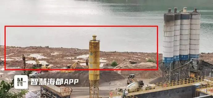 從高處俯瞰整片工地,可看到工地位于內海的南側,不少廠房建設完工,一些渣土車和推土機在廠區內來回運輸。在工廠的一側,可以看到一處被填埋的海域還沒有恢復原貌,三四臺挖掘機和推土機正在作業,一旁還有水泥攪拌車。