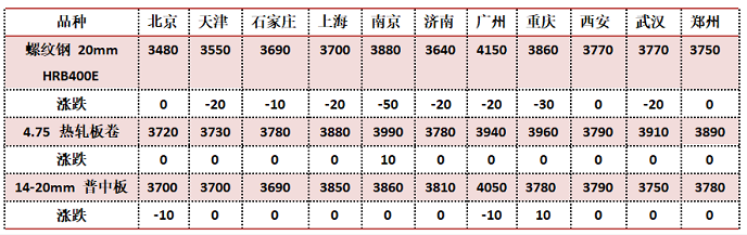 【中板】全國23個主要市場14-20mm 普中板平均價格3823元/噸,較上個交易日價格相同。
