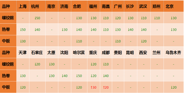 期貨大跌近百點:期螺主力10合約下跌76收報3169,熱卷主力10合約下跌91收報2999。鐵礦主力09合約下跌15.5收報557.5,焦炭主力09合約下跌80.5收報1594,焦煤主力05合約下跌11收報1243.5。螺紋鋼24個市場中13個市場下跌10-50,20mmHRB400E平均價格3582元/噸,較上個交易日下調12元/噸;熱卷24個市場中16個市場下跌10-50,4.75熱軋板卷平均價格3418元/噸,較上個交易日下調23元/噸;