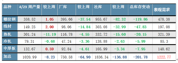 4月以來,降庫提速,表觀需求達到旺季水平,且最后一周再創(chuàng)新高,五大品種表觀需求1222萬噸,降庫加速,總庫存下降201萬噸。值得一提的是,產(chǎn)量由增轉(zhuǎn)降,出現(xiàn)8萬噸的回落,提振市場信心,黑色系順勢拉漲,帶動現(xiàn)貨成交好轉(zhuǎn)。