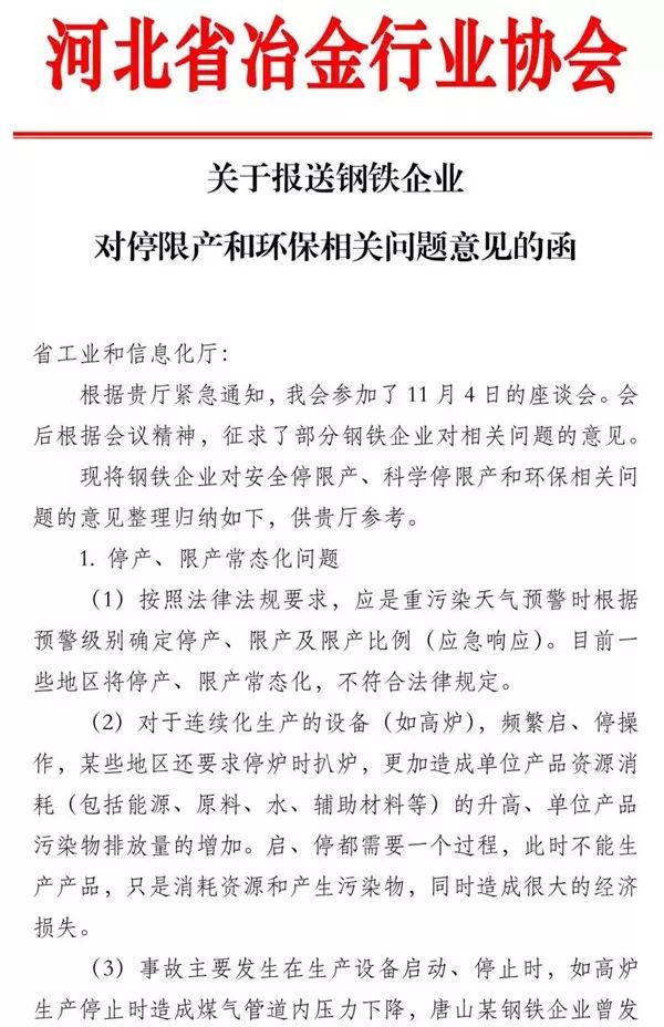 11月5日,河北省冶金行業(yè)協(xié)會(huì)根據(jù)會(huì)議精神,征求了部分鋼鐵企業(yè)對(duì)相關(guān)問題的意見。將鋼鐵行業(yè)對(duì)安全停限產(chǎn)、科學(xué)停限產(chǎn)和環(huán)保相關(guān)問題的意見進(jìn)行了整理歸納,以供河北省工業(yè)信息化廳參考。