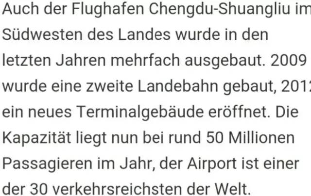 位于中國西南的成都雙流國際機場近幾年多次擴建,2009年建成了第二跑道。2012年,新航站樓投入運營。現在,機場的年旅客承載能力已經達到了約5千萬人次,是世界最繁忙的三十個交通樞紐之一。