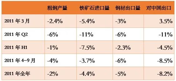 2011年日本3.11地震后的鋼鐵表現(xiàn)(同比)