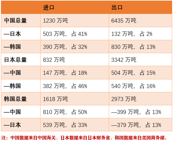 2019年中國、日本和韓國鋼材進(jìn)出口關(guān)系