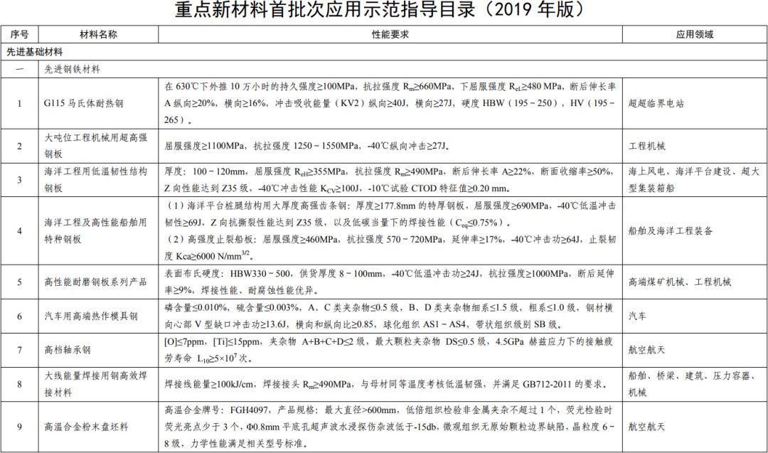 為進一步做好重點新材料首批次應用保險補償試點工作,日前,工業和信息化部發布《重點新材料首批次應用示范指導目錄(2019年版)》(以下簡稱《目錄2019版》),G115 馬氏體耐熱鋼、大噸位工程機械用超高強鋼板、海洋工程用低溫韌性結構鋼板等40種先進鋼鐵材料入選。