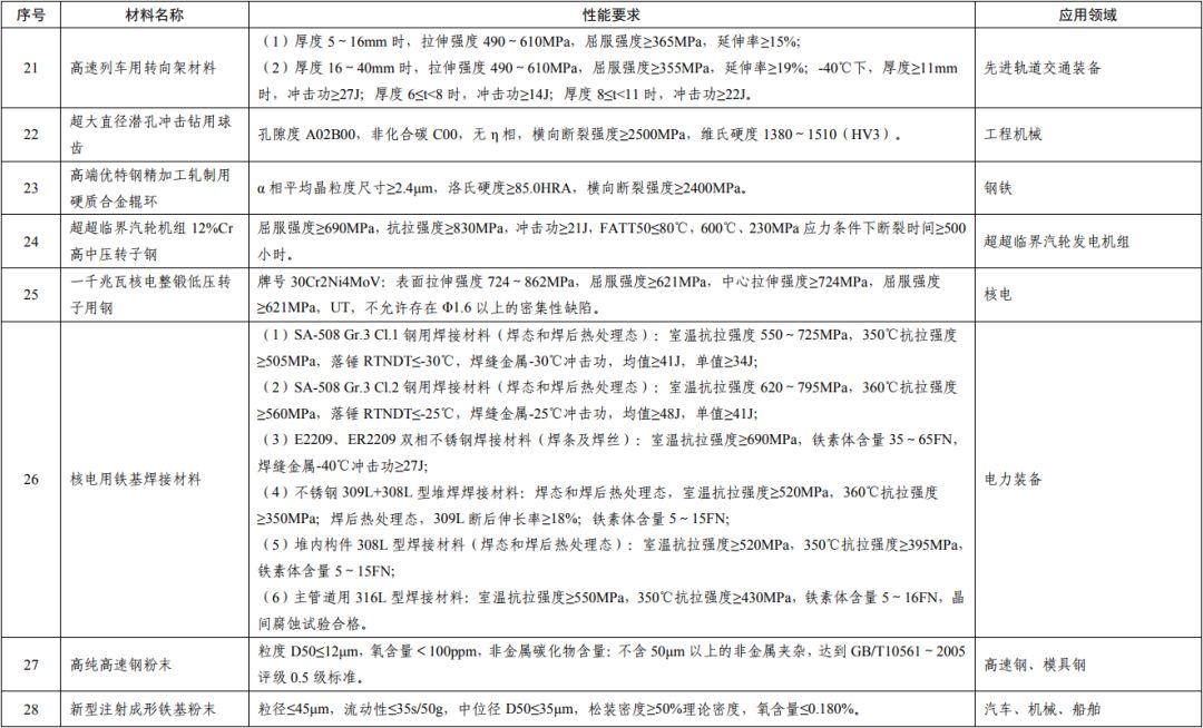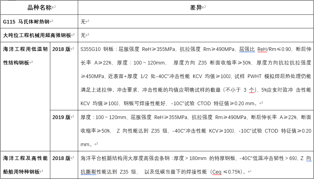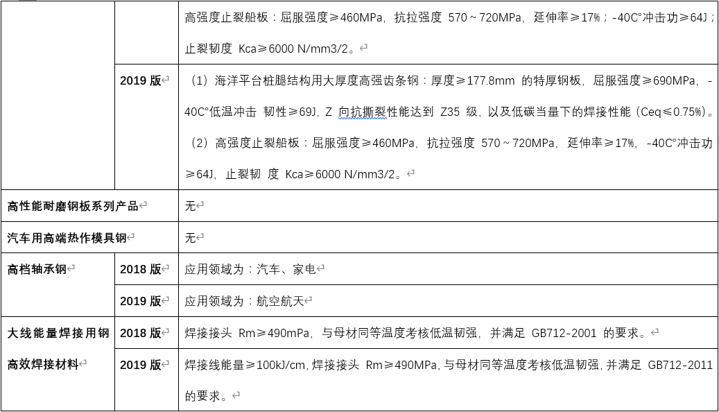 《目錄2019版》與《目錄2018版》相比,有11種先進鋼鐵材料的名稱相同,但部分材料的性能要求和應用領域有所不同: