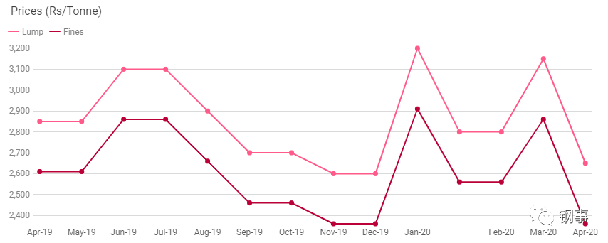 NMDC在遞交給印度孟買證券交易所(BSE)的公告中稱,其4月份塊礦(65.5%品位)價格為2650盧比/噸(約合35美元/噸)、粉礦(64%品位)價格為2360盧比/噸(約合31.2美元/噸),比3月份均下降了500盧比/噸(約合6.6美元/噸),降幅分別為16%和17.5%;比去年同期分別下降了200盧比/噸和250盧比/噸,降幅分別為7%和9.6%。