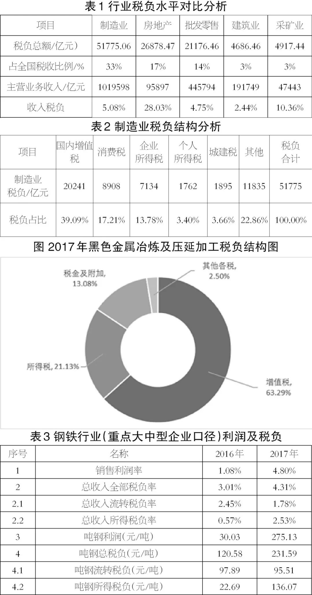 鋼鐵工業是國民經濟中的重要組成部分,也是向國家上交稅金最多的行業之一。2017年重點大中型鋼鐵企業累計實現工業增加值6143.88億元,占同期全國GDP的0.75%;實現稅金1604.57億元,占同期國家稅收的1.11%。鋼鐵工業作為國家支柱產業,在經濟建設、社會發展、財政稅收、國防建設以及穩定就業等方面發揮著重要作用,對保障國民經濟又好又快發展做出了重要貢獻,在發展過程中,稅負重、利潤不高等問題制約行業健康發展,因此,在公平、合理稅負問題上有值得研究和進一步改革的必要。