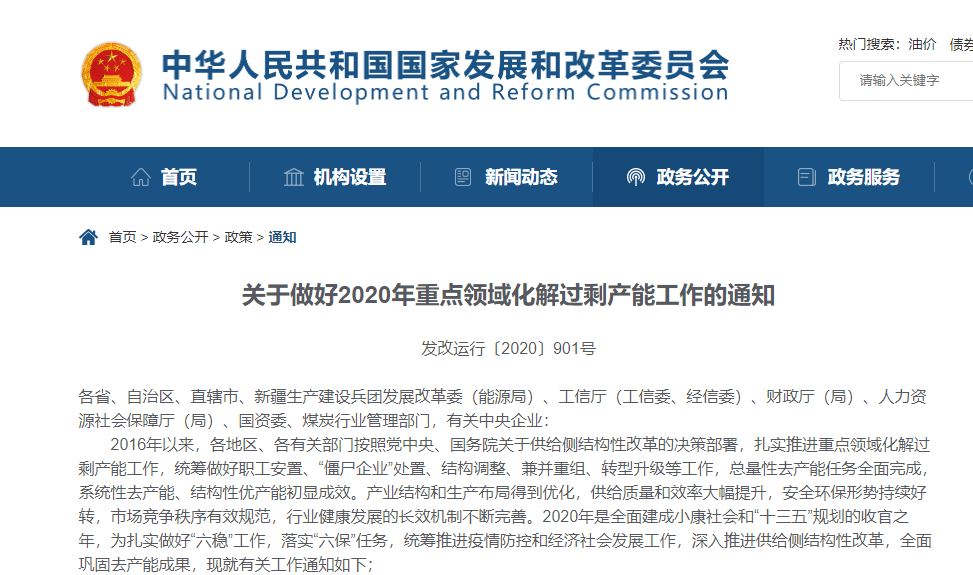 2020年是全面建成小康社會和“十三五”規劃的收官之年,為扎實做好“六穩”工作,落實“六保”任務,統籌推進疫情防控和經濟社會發展工作,深入推進供給側結構性改革,全面鞏固去產能成果,6月12日國家發改委發布《關于做好2020年重點領域化解產能工作的通知》。