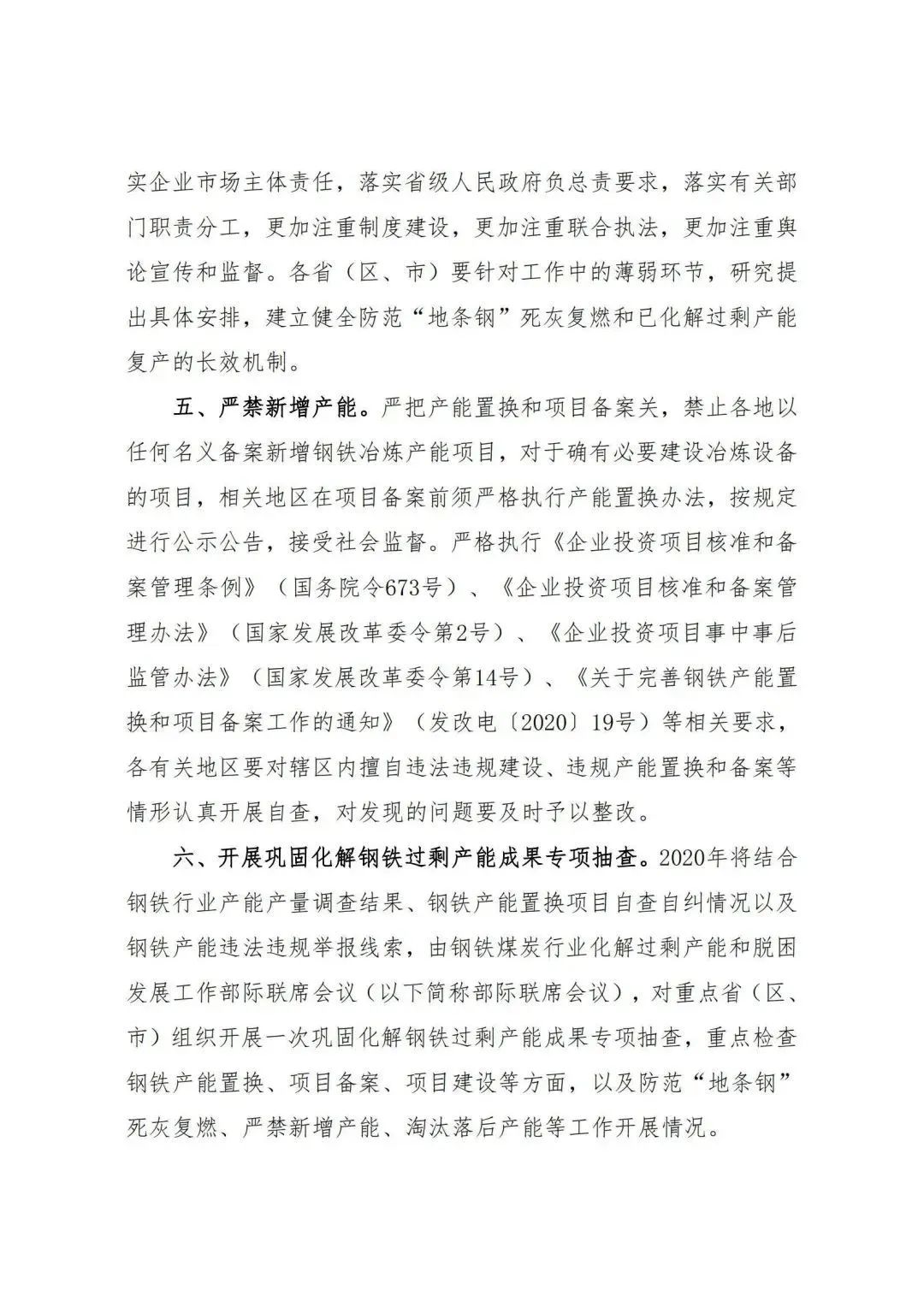 關于做好2020年重點領域化解過剩產能工作的通知 發改運行〔2020〕901號 各省、自治區、直轄市、新疆生產建設兵團發展改革委(能源局)、工信廳(工信委、經信委)、財政廳(局)、人力資源社會保障廳(局)、國資委、煤炭行業管理部門,有關中央企業: 2016年以來,各地區、各有關部門按照黨中央、國務院關于供給側結構性改革的決策部署,扎實推進重點領域化解過剩產能工作,統籌做好職工安置、“僵尸企業”處置、結構調整、兼并重組、轉型升級等工作,總量性去產能任務全面完成,系統性去產能、結構性優產能初顯成效。產業結構和生產布局得到優化,供給質量和效率大幅提升,安全環保形勢持續好轉,市場競爭秩序有效規范,行業健康發展的長效機制不斷完善。2020年是全面建成小康社會和“十三五”規劃的收官之年,為扎實做好“六穩”工作,落實“六保”任務,統籌推進疫情防控和經濟社會發展工作,深入推進供給側結構性改革,全面鞏固去產能成果,現就有關工作通知如下; 一、準確把握2020年去產能總體要求。以習近平新時代中國特色社會主義思想為指導,全面貫徹黨的十九大和十九屆二中、三中、四中全會精神,按照中央經濟工作會議要求,緊扣全面建成小康社會目標任務,堅持穩中求進工作總基調,堅持新發展理念,堅持以供給側結構性改革為主線,堅持以改革開放為動力,推動高質量發展。堅持鞏固、增強、提升、暢通的方針,著力鞏固去產能成果,持續推動系統性去產能、結構性優產能,不斷提升職工安置和資產債務處置質量,全面提高行業治理能力。 二、全面鞏固去產能成果。尚未完成“十三五”去產能目標的地區和中央企業,要統籌推進各項工作,確保去產能任務在2020年底前全面完成。全面實施去產能項目“回頭看”,認真落實產能認定、關閉標準、獎補資金使用、產能置換等方面的相關規定,確保各類督查和自查發現的問題及時整改到位。國家有關部門將繼續開展鞏固鋼鐵煤炭去產能成果專項督查抽查,堅決防止已經退出的項目死灰復燃。進一步完善去產能和產能置換工作臺賬,為“十四五”發展打好基礎。切實抓好去產能政策的宣貫落實,強化監督問責,確保相關要求落實落細落地。 三、繼續深化鋼鐵行業供給側結構性改革。進一步完善鋼鐵產能置換辦法,加強鋼鐵產能項目備案指導,促進鋼鐵項目落地的科學性和合理性。進一步加強事中事后監管,嚴格落實安全、環保、能耗、質量、用地、產業政策和產能置換等相關要求,嚴禁以任何名義、任何方式新增鋼鐵冶煉產能,嚴肅查處各類鋼鐵產能違法違規行為,加快推動落后產能退出,嚴防“地條鋼”死灰復燃和已化解過剩產能復產。指導企業復工復產,做好行業運行監測分析,維護行業平穩運行。進一步推動鋼鐵行業綠色化發展,加快京津冀及周邊地區、長三角地區、汾渭平原等大氣污染防治重點區域鋼鐵企業超低排放改造,發展電爐鋼工藝。進一步推動鋼鐵企業實施兼并重組,增強企業創新意識,為鋼鐵行業實現由大到強轉變奠定堅實基礎。 四、持續推進煤炭上大壓小、增優汰劣。嚴格安全、環保、質量等方面執法,堅決淘汰不具備安全環保條件、不符合產業政策的落后產能。堅持產能置換長效機制,引導低效無效產能有序退出。深入推進煤炭行業“放管服”改革,加快推動在建煤礦投產達產,合理有序釋放先進產能,實現煤炭新舊產能有序接替。統籌推進煤電聯營、兼并重組、轉型升級等工作,促進煤炭及下游產業健康和諧發展。著力加強煤炭產供儲銷體系建設,持續提升供給體系質量,增強能源保障和應急調控能力。充分發揮市場配置資源的決定性作用,不斷完善現代煤炭交易市場體系,進一步降低交易成本、提高市場效率。 五、積極穩妥推進煤電優化升級。充分發揮市場調節和宏觀調控作用,淘汰關停不達標落后煤電機組。繼續做好現有違規建設煤電項目的清理整頓工作,堅決杜絕新發生違規建設煤電項目的情況。發布實施年度風險預警,按需有序核準建設煤電項目,按需適度新增煤電產能,做好煤電應急備用和應急調峰儲備電源工作。持續推進燃煤電廠超低排放和節能改造工作。進一步增強電力、熱力供應保障能力,鞏固化解煤電過剩產能工作成果,提升煤電清潔高效發展水平。 六、加快“僵尸企業”處置。認真貫徹落實黨中央、國務院關于“僵尸企業”處置的決策部署,依法依規加快處置2019年底摸底確定并上報國務院辦公廳的“僵尸企業”。各地區和中央企業要按照要求建立健全工作機制,履行主體責任,加強督促檢查,原則上在2020年底前完成已摸底確定并上報的鋼鐵、煤炭行業“僵尸企業”處置工作。 七、嚴格控制產能總量。更多運用市場化、法治化手段,在控制產能總量的前提下,調整優化存量。嚴格落實《關于完善鋼鐵產能置換和項目備案工作的通知》要求,暫停鋼鐵產能置換和項目備案,并開展自查自糾工作,確保鋼鐵項目要符合安全、環保、能耗、質量、用地、產業政策和產能置換等相關要求。嚴格禁止在國家公園、自然保護區、風景名勝區、飲用水水源保護區規劃布局新的煤礦項目,嚴格限制高硫高灰高砷煤項目開發。 八、統籌做好去產能保供應穩預期工作。有關地區和中央企業要充分認識供需形勢的新變化新特點,堅持實事求是、因地制宜,綜合考慮地