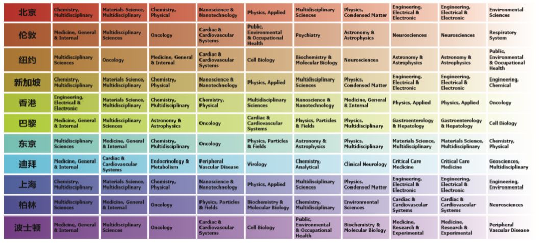 各代表性城市產(chǎn)出的高被引論文分布TOP 10的學科類別,共38個重點學科分類