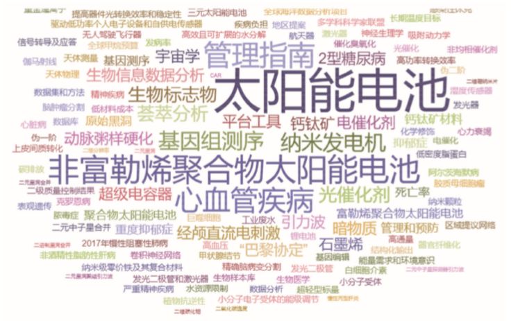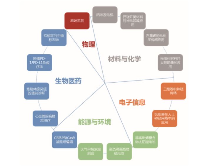 綜合判定的15個科技創(chuàng)新策源點分別為:納米發(fā)電機、非富勒烯聚合物太陽能電池、光催化材料的太陽能轉化應用、高負荷高能鋰硫電池、鈣鈦礦類材料的光電領域應用、CRISPR/Cas9基因組編輯、心血管疾病精準治療、腫瘤PD-1/PD-L1免疫療法、抑郁癥的生物標志物、路易體癡呆癥的鑒別診斷、三維卷積神經(jīng)網(wǎng)絡、石墨烯的電化學傳感應用、憶阻器在人工神經(jīng)網(wǎng)絡中的應用、大氣甲烷濃度劇變、原始黑洞。